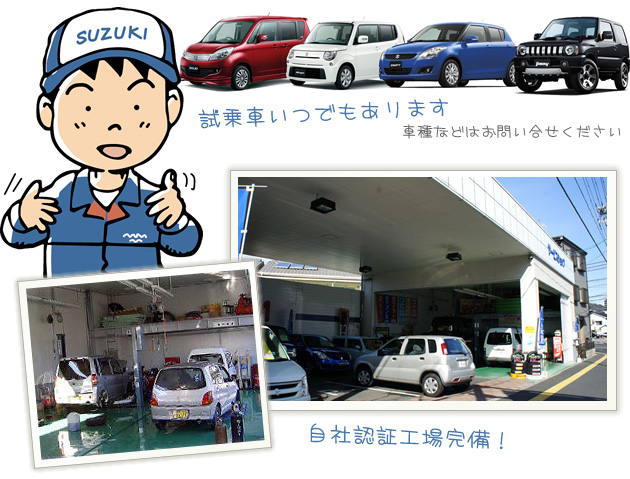 スズキ広島中央では、新車、中古車の販売はもちろん、車検、修理、板金、保険、タイヤ、アルミ、コンポ等のカー用品販売などお車に関わることはすべてお任せ下さい、格安でご提供させていただきます。気さくなカーアドバイザーがあなたのカーライフをサポート致します、もちろんアフターサービスも自社認証工場完備で安心、スピーディーです。お気軽にご来店してください。